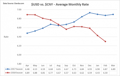 In our favour though, the USD is also weaker against the Chinese Yuan (CNY), as shown below. This makes lobsters more affordable in China and provides some headroom for the USD price to rise correspondingly, under the right market conditions, bringing the potential for NZD and AUD returns to be maintained.