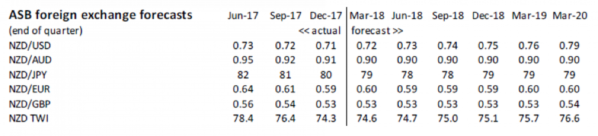 There are the usual risks around forecasts. The NZ economy is currently in a sweet spot of solid growth and low inflation, and the value of the NZD currently largely reflects that. We remain somewhat wary, however, of the potential for an adverse shock to derail the global expansion and take the NZD down a peg or two.